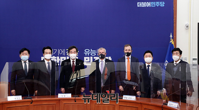 이낙연 더불어민주당 대표가 10일 오전 국회 당대표 회의실에 예방한 사이먼 스미스 주한영국대사와 함께 기념촬영을 하고 있다. (사진=더불어민주당)
