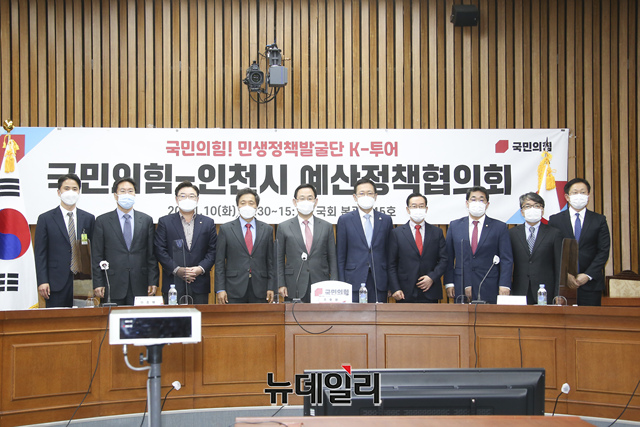 박남춘 인천시장, 주호영 원내대표 등 참석자들이 10일 오후 국회에서 열린 국민의힘·인천시 예산정책협의회에서 기념촬영하고 있다. (사진=국민의힘)