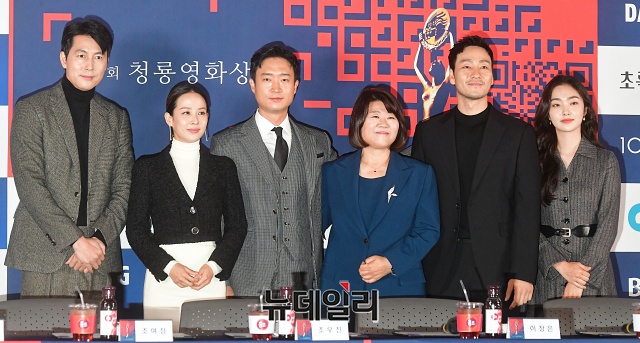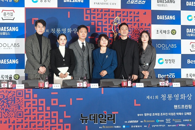 배우 정우성(왼쪽부터), 조여정, 조우진, 이정은, 박해수, 김혜준이 12일 오후 서울 여의도 CGV에서 열린 '제41회 청룡영화상 핸드프린팅 행사'에서 포토타임을 갖고 있다.