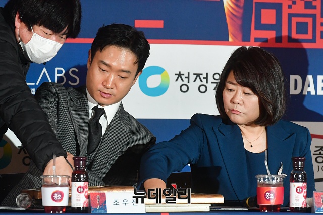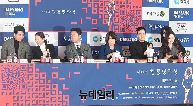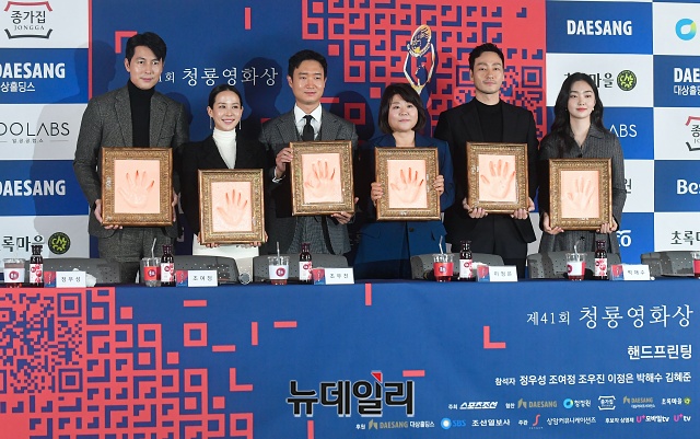 배우 정우성(왼쪽부터), 조여정, 조우진, 이정은, 박해수, 김혜준이 12일 오후 서울 여의도 CGV에서 열린 '제41회 청룡영화상 핸드프린팅 행사'에서 핸드프린팅을 마치고 포토타임을 갖고 있다.'청룡영화상 핸드프린팅'은 제40회 청룡영화상 남우주연상을 수상한 정우성, 여우주연상 조여정, 남우조연상 조우진, 여우조연상 이정은, 신인남우상 박해수, 신인여우상 김혜준 등 총 6명이 참여했다.올해 청룡영화상은 12월 11일 인천 영종도 파라다이스시티에서 개최된다.