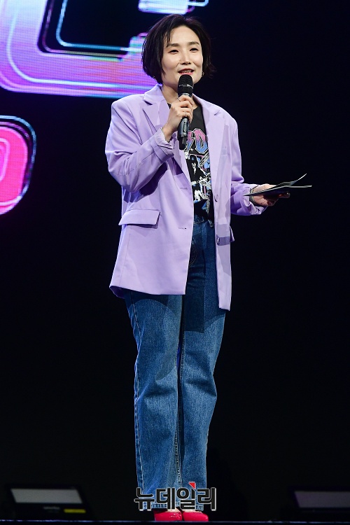 방송인 박경림이 12일 오후 서울 광진구 예스24 라이브홀에서 열린 스테이씨 첫번째 싱글 'Star To A Young Culture(스타 투 어 영 컬쳐)' 쇼케이스에서 인사말을 하고 있다.