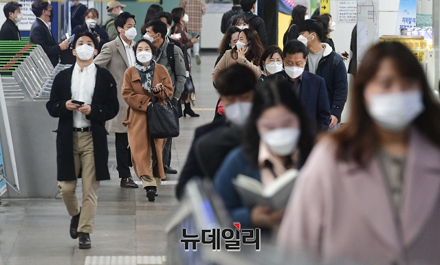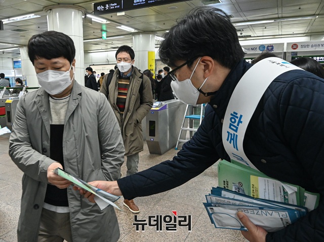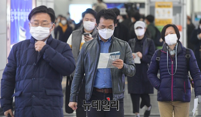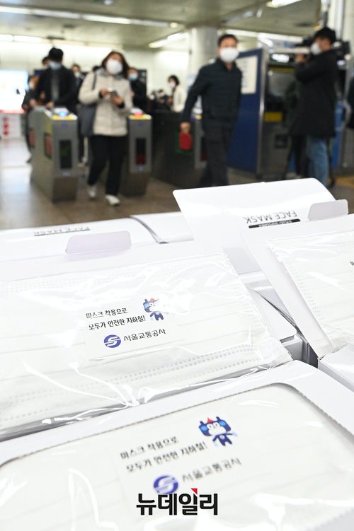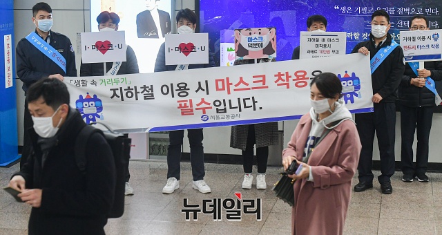 서울시 관계자들이 13일 오전 서울 종로구 광화문역에서 출근하는 시민들에게 안내문과 보건용 마스크를 나눠주고 있다.
