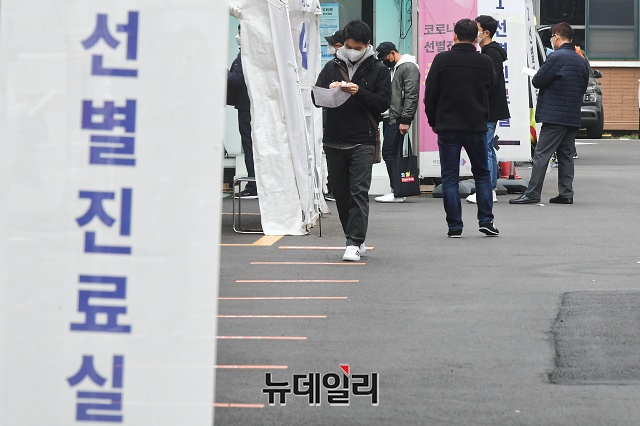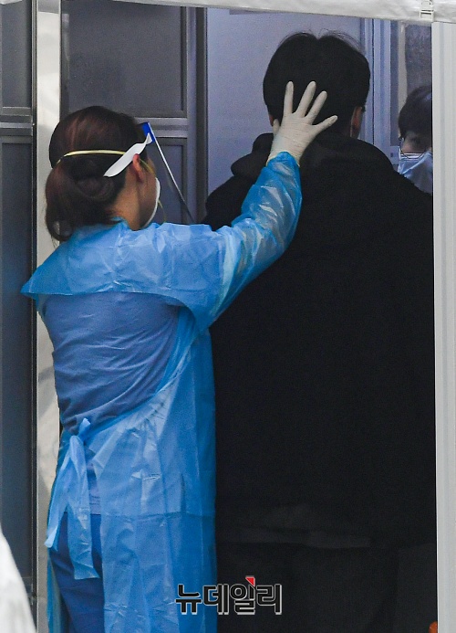 '코로나19(중국 우한 폐렴)' 신규 확진자가 191명 발생한 13일 오전 서울 중구 국립중앙의료원 선별진료소를 찾은 시민들이 확진검사를 받기 위해 줄 서 있다.