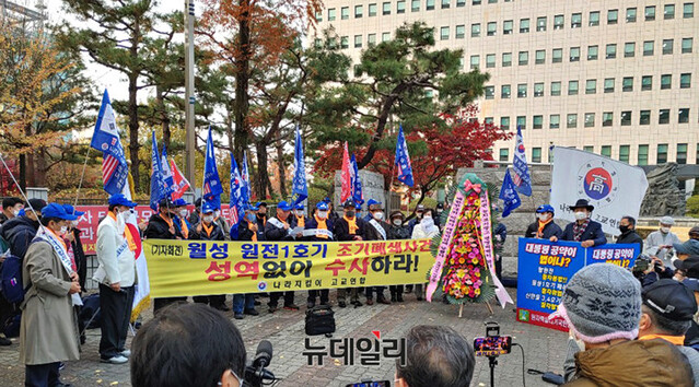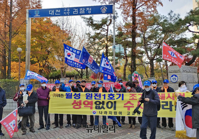 시민단체 나라지킴이고교연합이 13일 오후 대전지검 앞에서 '월성 원전 조기폐쇄 관련 대전지검 수사 촉구' 기자회견을 갖고 있다.