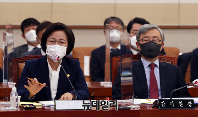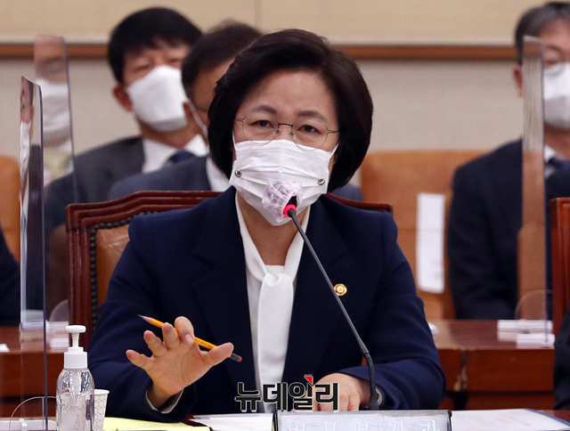 추미애 법무부 장관이 16일 오전 국회에서 열린 법제사법위원회 전체회의에 출석해 의원들 질의에 답하고 있다. (사진=공동취재단)