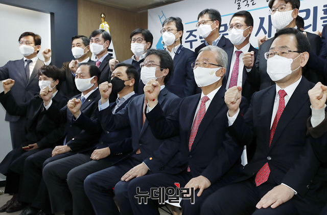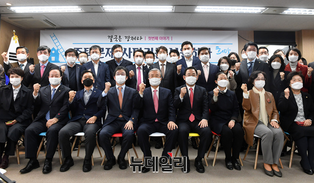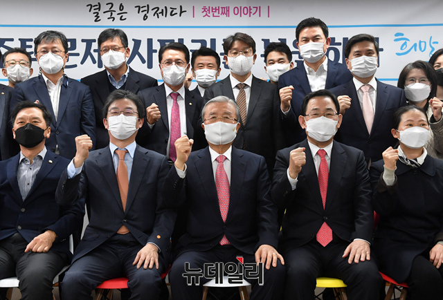 김종인 국민의힘 비상대책위원장, 주호영 원내대표 유승민 전 의원 등 참석자들이 16일 서울 여의도 유 전 의원의 사무소 '희망22' 개소식에 참석해 가념사진을 촬영하고 있다. (사진=공동취재단)
