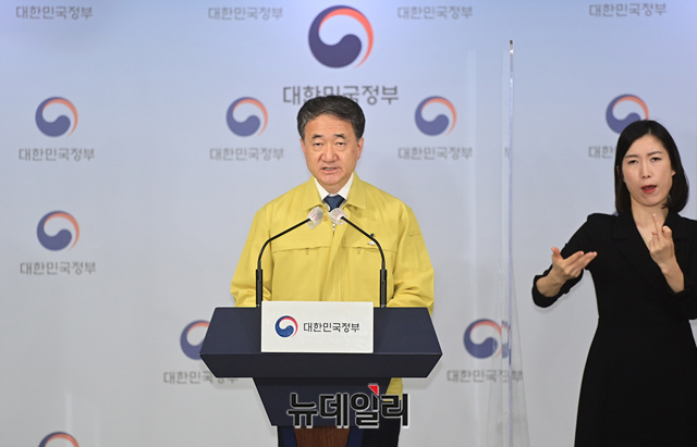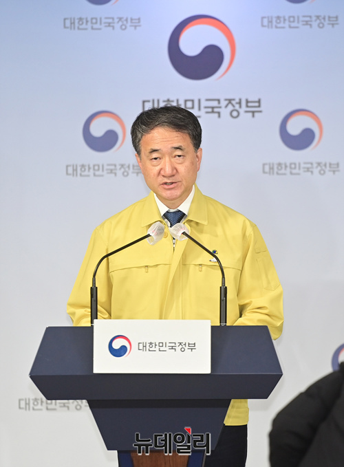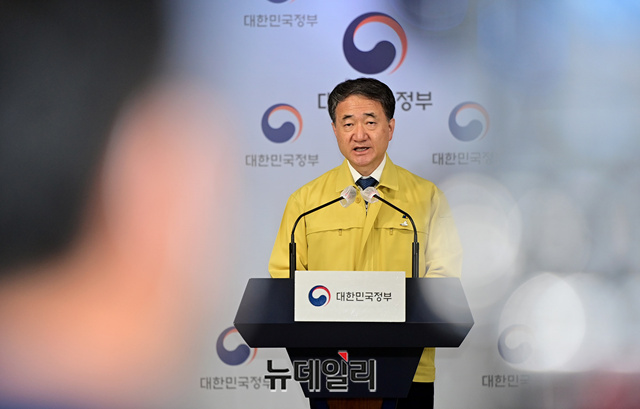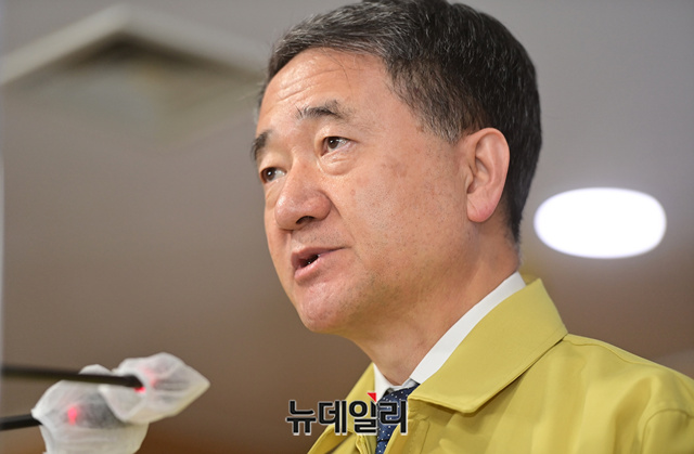박능후 보건복지부 장관이 17일 정오 서울 종로구 정부서울청사 브리핑실에서 수도권 지역의 사회적 거리두기 단계를 1.5로 격상하는 내용을 발표하고 있다.