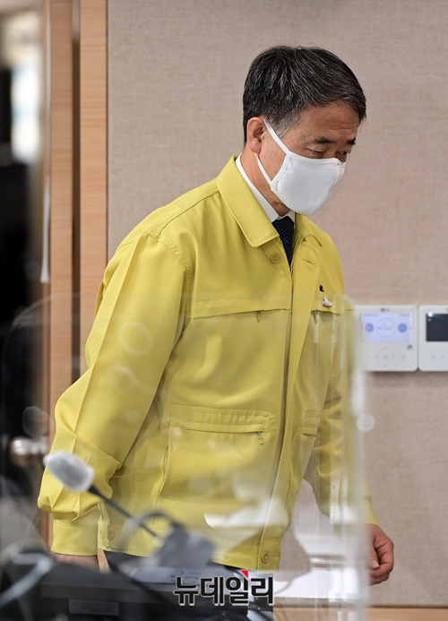 박능후 보건복지부 장관이 17일 정오 서울 종로구 정부서울청사 브리핑실에서 수도권 지역의 사회적 거리두기 단계를 1.5로 격상하는 내용을 발표하기 위해 입장하과 있다.