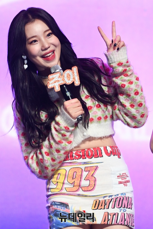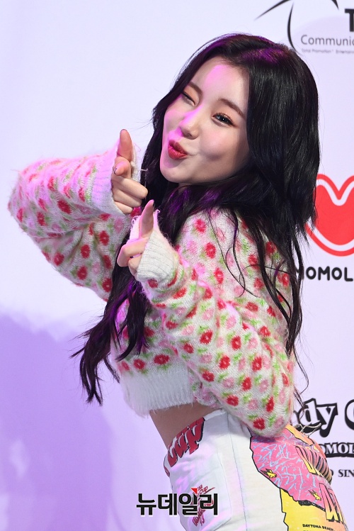 걸그룹 모모랜드의 멤버 주이가 17일 오후 서울 광진구 예스24 라이브홀에서 열린 3집 싱글 '레디 오어 낫(Ready Or Not)' 쇼케이스에서 포토타임을 갖고 있다.