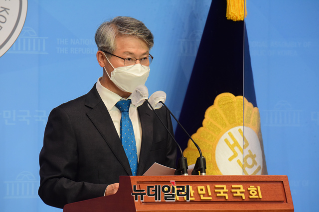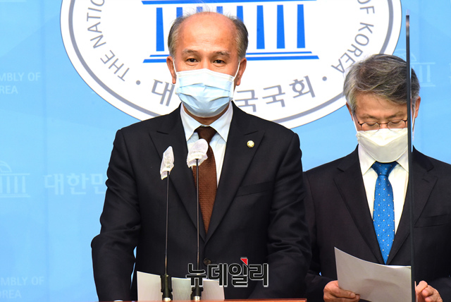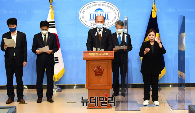 오기형·이정문· 민형배· 이용우 더불어민주당 의원이 17일 오후 국회 소통관에서 기자회견을 갖고 산업은행의 '대한항공-아시아나항공 통합추진' 이의제기 기자회견을 갖고 있다.