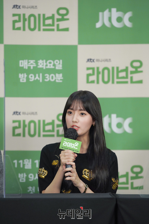 배우 정다빈이 17일 오후 온라인으로 열린 JTBC 새 화요드라마 '라이브온(연출 김상우, 극본 방유정)' 제작발표회에서 포토타임을 갖고 있다. 제작보고회에는 배우 황민현, 정다빈, 노종현, 양혜지, 연우, 최병찬과 김상우 감독이 참석했다.'라이브온'은 수상한 목적을 가지고 방송부에 들어간 서연고등학교 셀럽 백호랑(정다빈 분)이 엄격한 방송부장 고은택(황민현 분)을 만나며 겪는 로맨스 드라마다. 17일 밤 9시 30분에 첫 방송. (사진=JTBC)