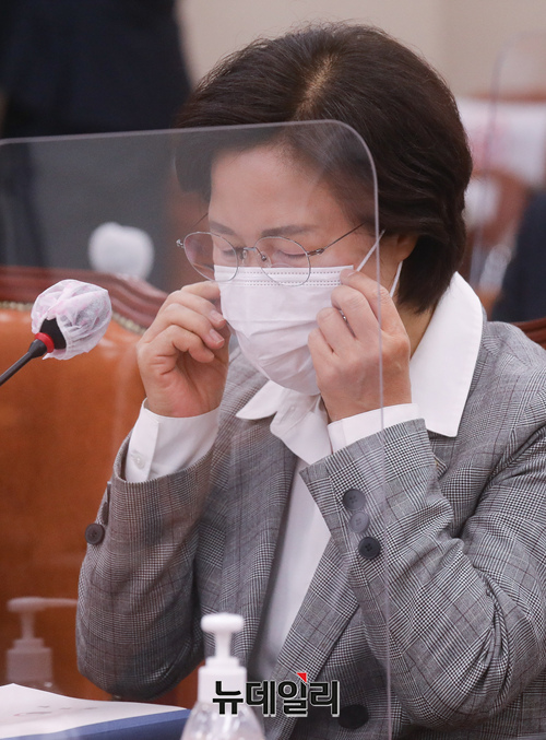 추미애 법무부 장관이 18일 오전 국회에서 열린 법제사법위원회 전체회의에서 안경을 쓰고 있다. (사진=공동취재단)