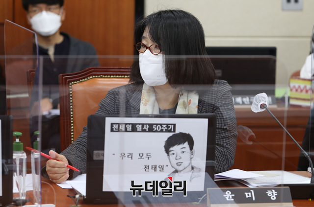 윤미향 더불어민주당 의원이 18일 국회에서 열린 국회 환경노동위원회의 ILO 핵심협약 비준 준비를 위한 입법 공청회에서 안경을 만지고 있다. (사진=공동취재단)