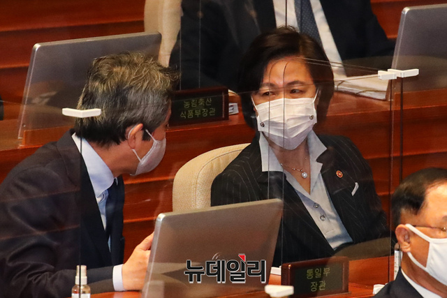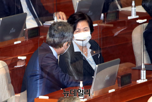 추미애 법무부 장관과 이인영 통일부 장관이 19일 오후 국회에서 열린 본회의에서 대화를 나누고 있다. (사진=공동취재단)