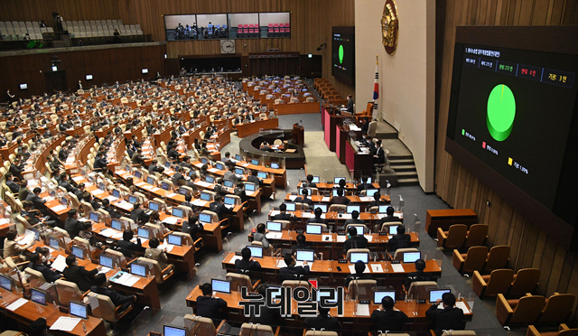 검찰청법 일부개정법률안이 19일 국회에서 열린 본회의에서 참성 250인, 반대 10인, 기권 19일으로 가결되고 있다. (사진=공동취재단)