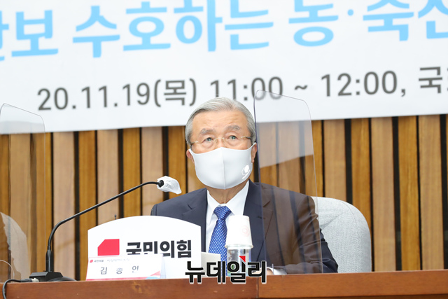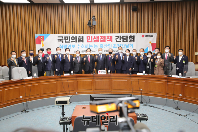 김종인 국민의힘 비상대책위원장, 주호영 원내대표 및 참석자들이 19일 오전 국회에서 열린 '식량안보 수호하는 농·축산인 초청 민생정책 간담회'에서 기념촬영을 하고 있다. (사진=국민의힘)