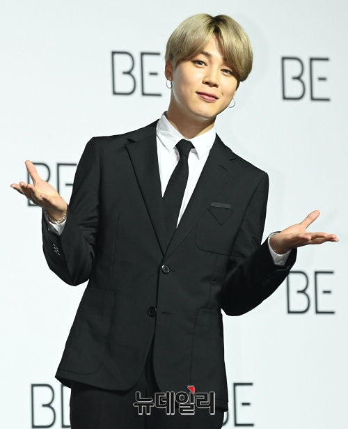방탄소년단 멤버 지민이 20일 오전 서울 중구 동대문디자인플라자에서 열린 새 앨범 'BE(비)' 글로벌 기자간담회에서 포토타임을 갖고 있다.