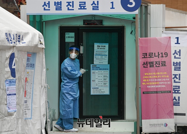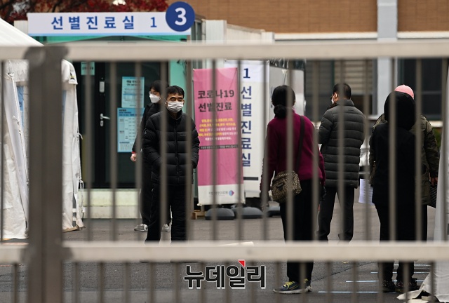 '코로나19(중국 우한 폐렴)' 신규 확진자가 363명 발생한 20일 오후 서울 중구 국립중앙의료원 선별진료소에서 시민들이 검사를 받기 위해 대기하고 있다. 신규 확진자는 사흘 연속 300명 대를 기록했다.