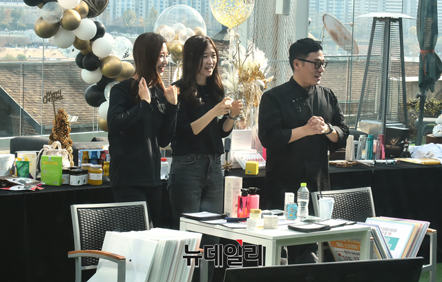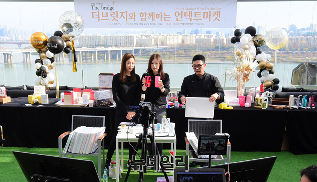 아나운서 이선영, 셰프 토니오, 미스코리아 한경진이 21일 오후 서울 용산구 메종한남에서 열린 '연예인 자원봉사단 더브릿지와 함께하는 언택트마켓' 을 진행하고 있다. 이번 온라인 바자회 수익금 전액은 여성 노숙자들을 위해 사용된다.