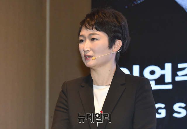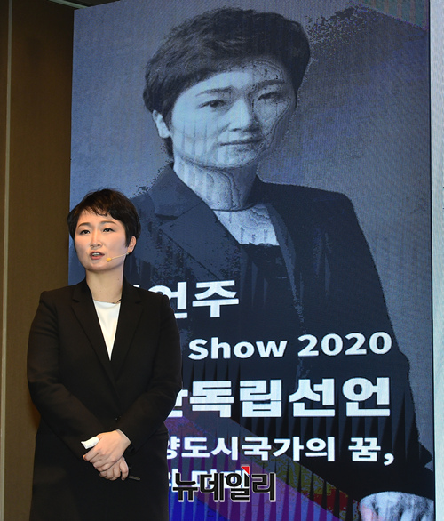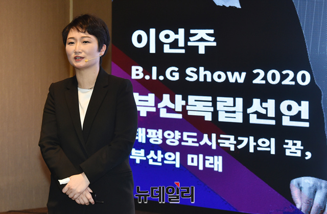 이언주 전 미래통합당 의원이 23일 오후 서울 여의도 켄싱턴호텔에서 열린 본인의 '부산독립선언' 출판기념회에서 발언을 하고 있다.