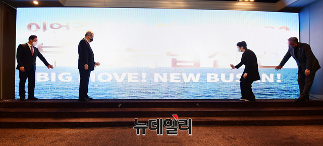 이언주 전 미래통합당 의원, 김종인 국민의힘 비대위원장, 이종배 정책위의장, 정진석 의원이 23일 오후 서울 여의도 켄싱턴호텔에서 열린 이 전 의원의 '부산독립선언' 출판기념회에서 기념사진을 촬영하고 있다.