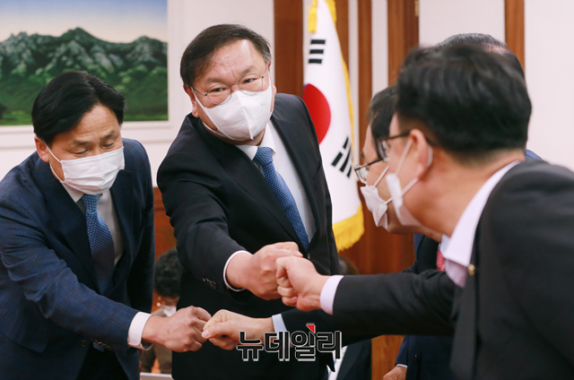박병석 국회의장이 23일 오후 국회 의장실에서 여야 원내대표와 만나 인사를 나누고 있다. (왼쪽부터 김영진 더불어민주당 원내수석부대표, 김태년 원내대표, 박 의장, 주호영 국민의힘 원내대표, 김성원 원내수석부대표) (사진=공동취재단)