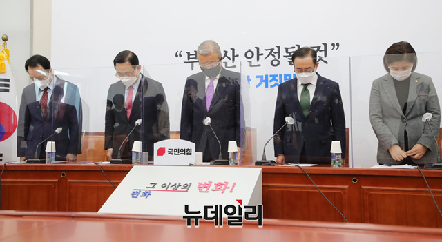 김종인 국민의힘 비상대책위원장, 주호영 원내대표 등 지도부가 23일 오전 국회에서 열린 비상대책위원회의에 앞서 연평도 포격전 10주기 관련 묵념을 하고 있다. (사진=국민의힘)