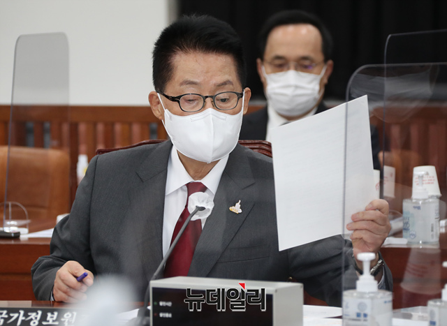 박지원 국정원장이 24일 오후 국회에서 열린 정보위원회 전체회의에 참석해 회의시작을 기다리고 있다. (사진=공동취재단)