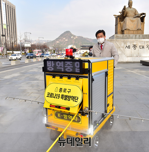 김선동 국민의힘 전 사무총장이 25일 오전 서울 광화문광장에서 서울시장 출마선언을 마치고 K-방역차를 타고 광장을 방역하는 퍼포먼스를 하고 있다.