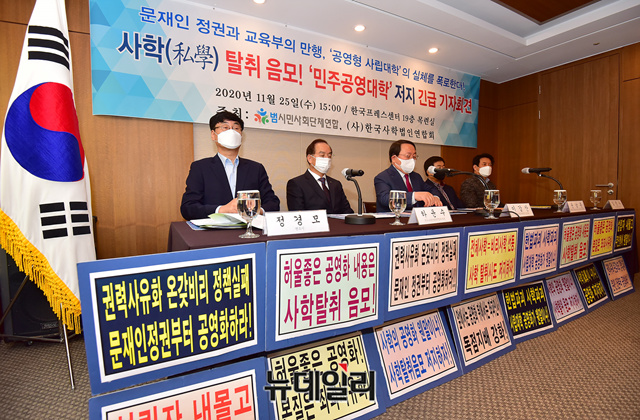 우리는 사립학교에 대한 소유와 운영권을 탈취하여 “공영화하겠다”는 것 자체가 전체주의적 발상이라 규정하고, 사립대학교를 ‘민주공영대학’이라고 호칭하는 것은 헌법과 고등교육법 제3조와 교육기본법 등을 정면으로 위반한 위법한 행위이기에 결사 저지할 것을 천명한다.