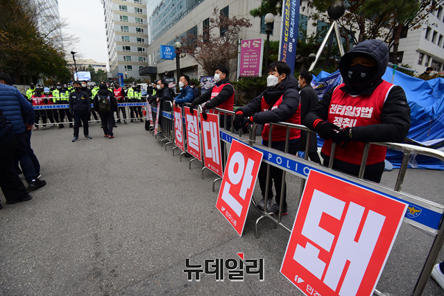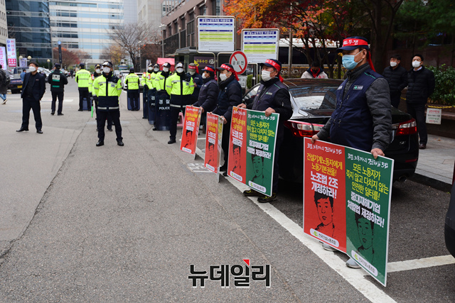 민노총 관계자들이 25일 오후 서울 여의도 더불어민주당 중앙당사 인근에서 '노동개악 저지! 전태일3법 쟁취! 민주노총 총파업 총력투쟁 전국동시다발대회'를 갖고 있다. 이날 민노총은 10명 이하로 집회 참석자들을 소규모로 쪼개 인근 거리를 채웠다.
