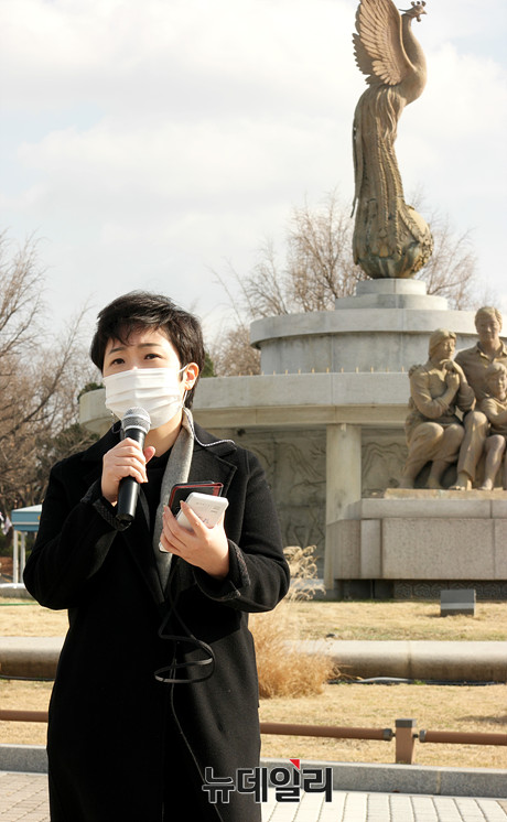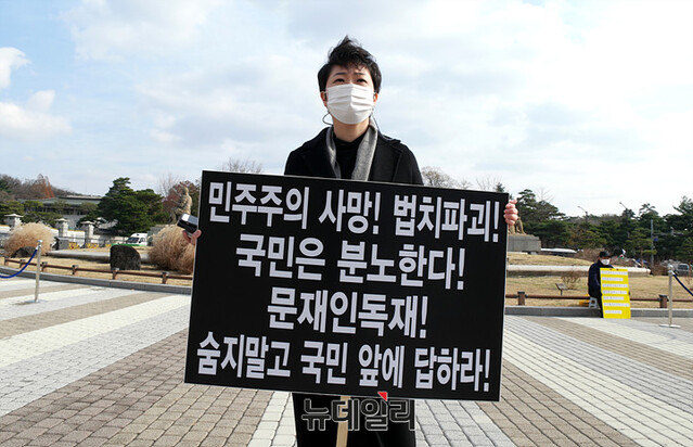 이언주 전 국민의힘 의원이 27일 오전 서울 종로구 청와대 앞 분수대에서 윤석열 검찰총장 직무배제 지시를 내린 추미애 장관을 규탄하는 1인 시위를 하고 있다.