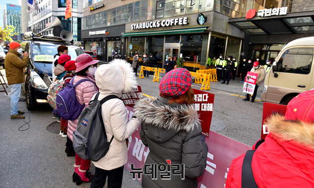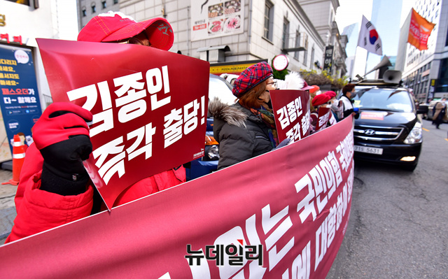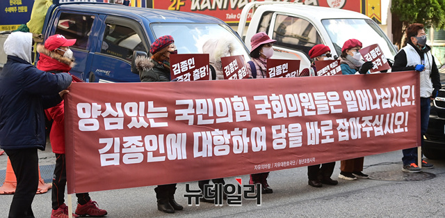 우파시민단체 자유대한호국단이 27일 정오 서울 여의도 국민의힘 당사 앞에서 지난 20일에 이어 김종인 비상대책위원장의 출당을 촉구하는 기자회견을 갖고 있다.
