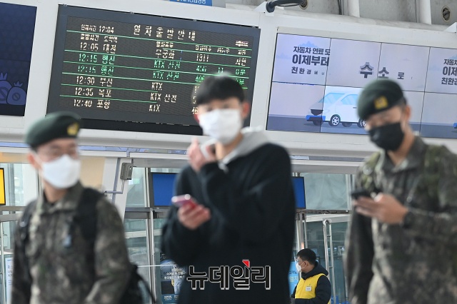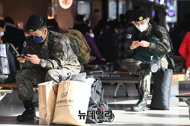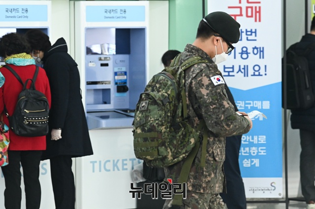 군인장병이 27일 오후 서울 용산구 서울역에서 기차표를 끊고 있다.