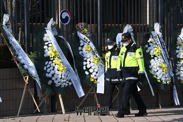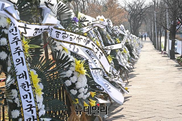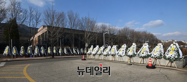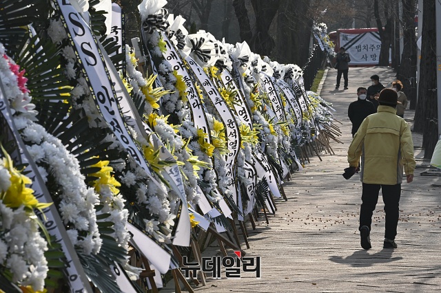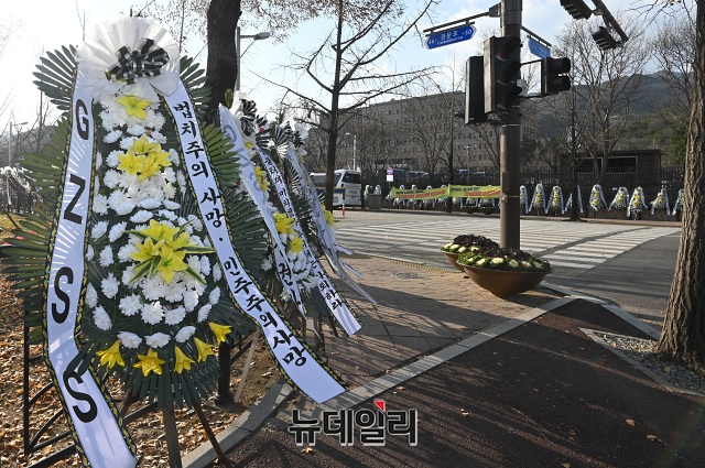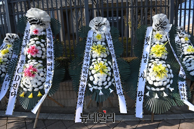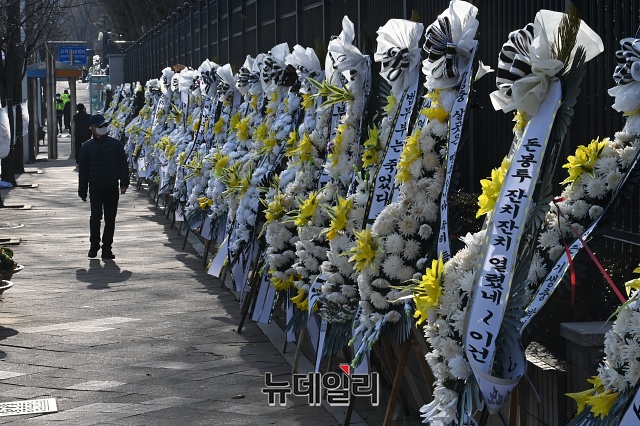 추미애 장관을 비판하는 근조화환 340여개가 27일 오후 경기 과천시 정부과천청사 앞에 놓여있다.전국 각지에서 보낸 근조화환에는 '법치주의 사망' '추미애 장관 내려와라' 등 추 장관을 비판하는 메세지가 적혔다.시민단체 자유연대는 22일부터 법무부가 위치한 정부과천청사 앞에 근조 화환을 설치했다. 이후 전국 각지에서 화환을 설치해 27일 현재 340여 개의 화환이 설치된 상태다.자유연대는 28일 법무부 앞에서 '추미애발 법치살해에 저항하는 검사들을 응원한다!'라는 슬로건으로 '민주주의·법무부 사망' 진혼식과 상여발인 행진을 진행할 예정이다. (경기 과천=권창회 기자)