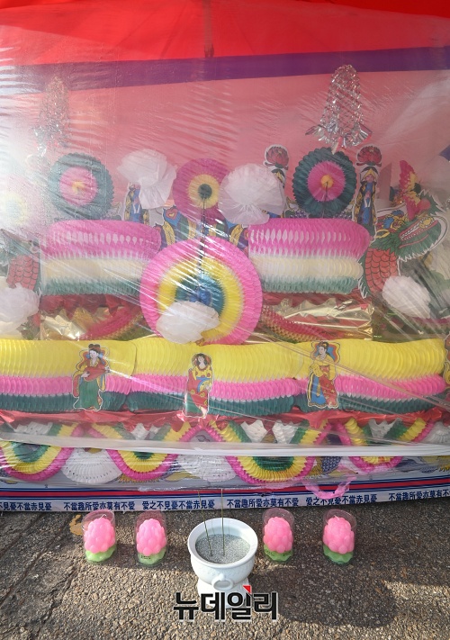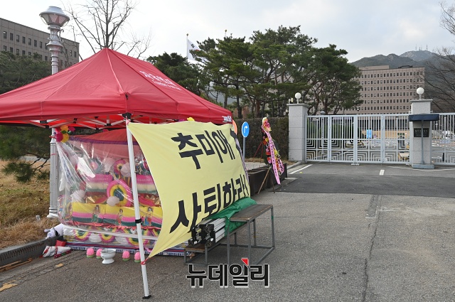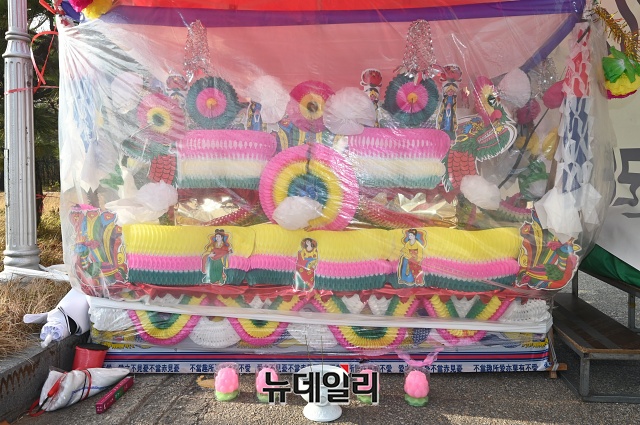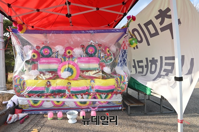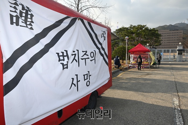 '민주주의 사망' '법치주의 사망' 의미가 담긴 꽃상여가 27일 오후 법무부가 있는 정부과천청사 앞에 놓여있다.