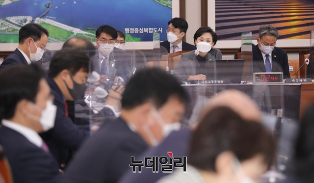 김현미 국토교통부장관이 30일 오전도 국회에서 열린 국회 국토교통위원회 전체회의에 출석해 머리를 긁적이고 있다. (사진=공동취재단)