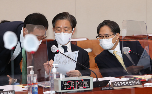 성윤모 산업통상자원부 장관이 30일 오후 국회 산업통상자원중소벤처기업위원회 전체회의에 출석해 보좌진들과 대화를 나누고 있다. (사진=공동취재단)