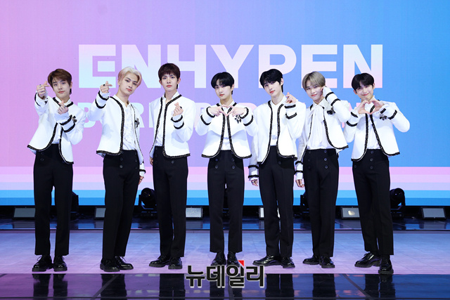 CJ ENM과 빅히트엔터테인먼트가 합작한 빌리프랩 소속 아이돌그룹 '엔하이픈(ENHYPEN)'이 30일 오후 온라인으로 열린 데뷔 앨범 'BORDER : DAY ONE(보더:데이 원)' 쇼케이스에서 포토타임을 갖고 있다.