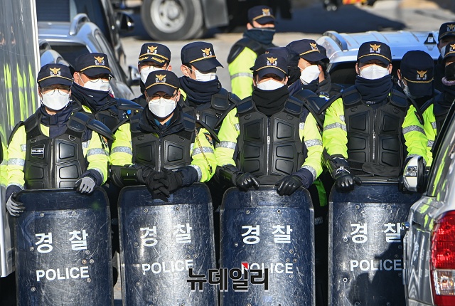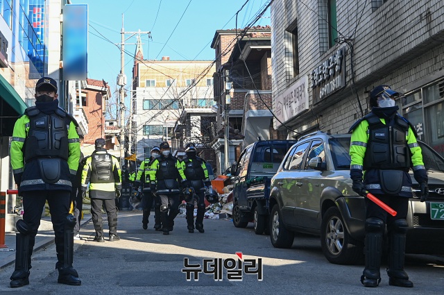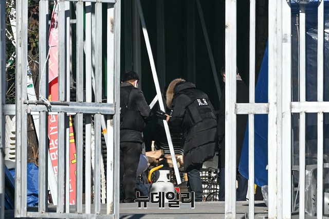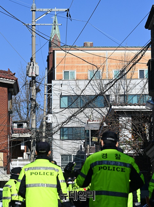 경찰이 1일 오전 서울 성북구 사랑제일교회에서 압수수색을 하고 있다. 경찰은 11월 26일 사랑제일교회 강제철거 집행과정에서 교회측의 화염병 투척 등 특수공무집행방해 혐의로 오전 9시25분부터 압수수색에 착수했다.