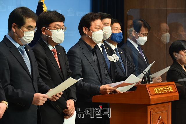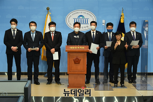 국민의힘 박완수 행정안전위원회 법안심사 제2소위원장과 여야 위원들이 2일 오후 국회 소통관에서 경찰법 전부개정안 관련 기자회견을 하고 있다. (왼쪽부터 오영환, 양기대 더불어민주당, 서범수 국민의힘 의원, 박완수 제2소위원장, 이해식 더불어민주당 의원)