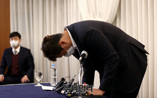 판공비 셀프 인상 논란을 받고 있는 한국프로야구선수협회장 이대호 선수가 2일 오후 서울 강남구 리베라호텔에서 기자회견을 갖고 있다.앞서 1일 SBS는 이대호가 선수협회 판공비를 기존 3,000만원에서 6,000만원으로 인상해 사용하고, 개인 계좌로 입금받았다고 보도했다.이대회는 기자회견을 통해 "선수협회 회장으로 누가 당선될지 전혀 모르는 상황에서 저의 이익만을 위해 판공비를 스스로 인상한 것은 아니었다"며 "선수협회에서는 판공비는 세금 공제 후 지급하고 별도 지급되는 수당은 전혀 없다. 이 관행이 문제가 된다면 조속히 바로잡도록 하겠다"고 말했다.