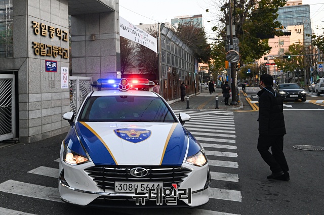 2021학년도 대학수학능력시험일인 3일 오전 서울 성동구 경일고등학교에서 시험장을 잘못 온 한 수험생이 경찰차에 탑승하고 있다.올해 수능일은 11월 19일이었으나 코로나19 여파로 2주 연기됐다. 이번 수능은 일반 수험생, 자가격리자, 확진자로 나눠 관리된다. 수험생들은 시험 내내 마스크를 착용해야 하고 책상 앞면에는 칸막이가 설치된다. 확진자는 병원·생활치료 시설에서 감독관 보호 조치 하에 수능을 치른다.오전 8시 40분 1교시 국어영역으로 시작해 오후 5시 40분 제2외국어를 마지막으로 마무리된다. 올해 수능 응시자는 49만 3,433명이다. 성적은 12월 23일 통지된다.