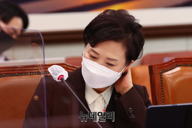 김현미 국토교통부장관이 3일 오전 국회에서 열린 국토교통위원회 전체회의에서 얼굴을 만진고 있다. (사진=공동취재단)