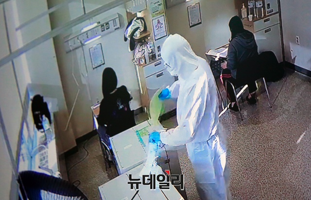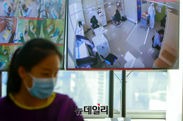 2021학년도 대학수학능력시험일인 3일 오전 서울 중랑구 서울의료원 격리병동에 마련된 임시 고사장에서 수험생이 시험을 치르는 모습이 폐쇄회로 속 화면으로 보이고 있다.