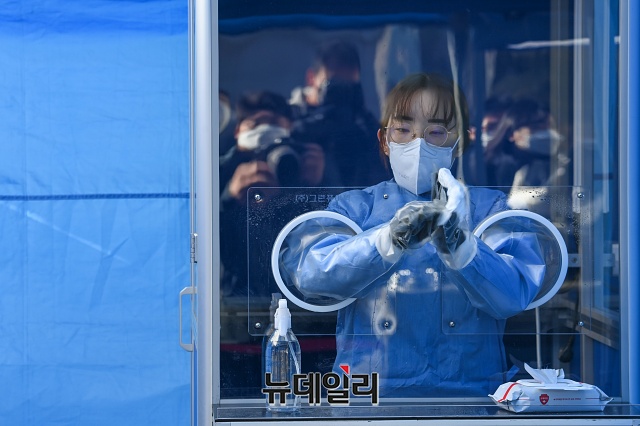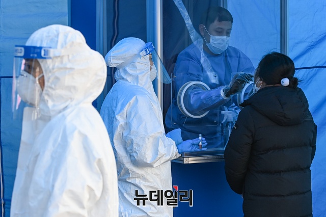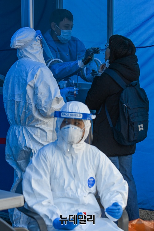 서울 종로구 서울시교육청에 마련된 코로나19 선별진료소에서 수능시험에 참여한 감독관들이 4일 오전 검사를 받고 있다.