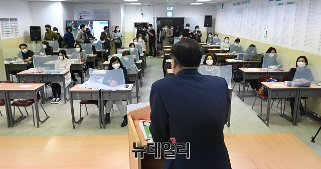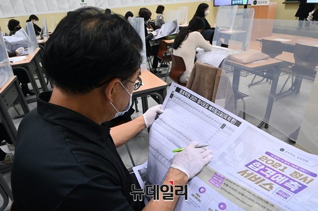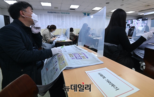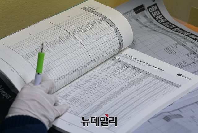 2021학년도 대입전략 설명회를 찾은 학부모들이 4일 오후 서울 강남구 종로학원에서 배치참고표를 살펴보고 있다. 이날 설명회는 코로나19 방역지침에 따라 최소한 인원만 참석해 온라인으로 생중계됐다.