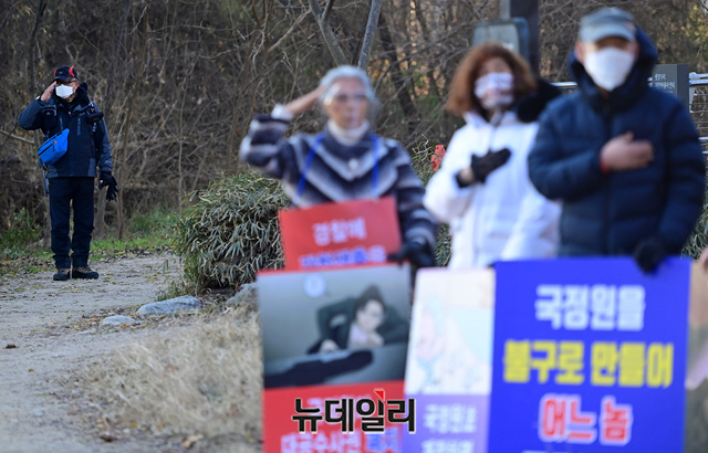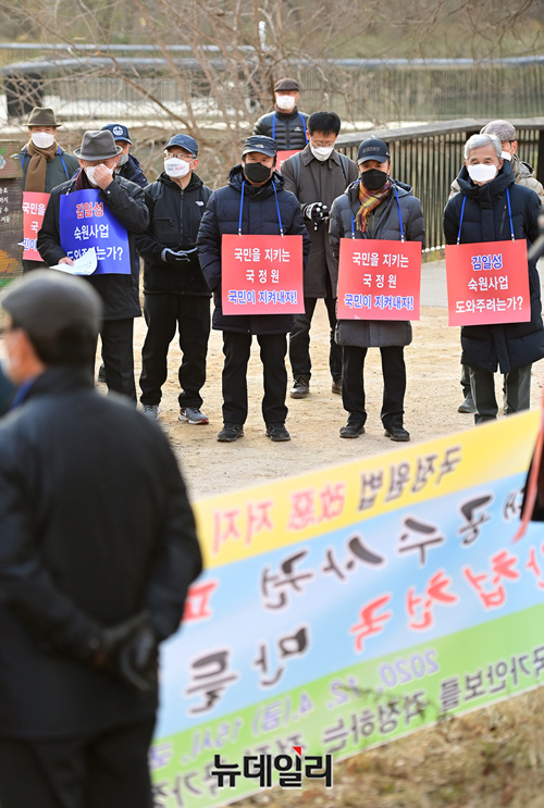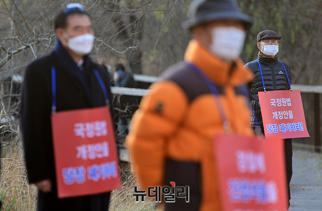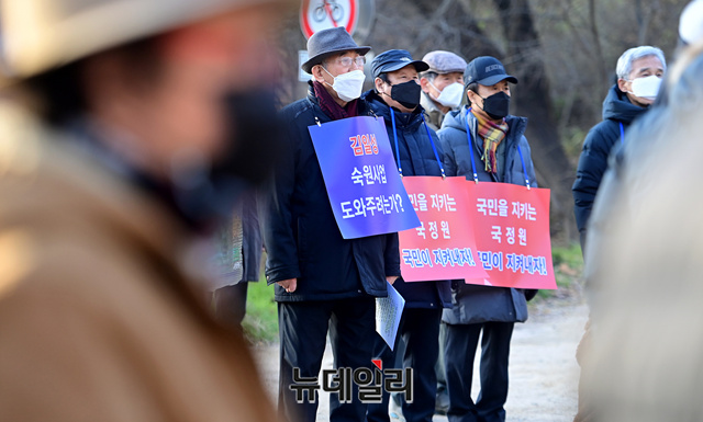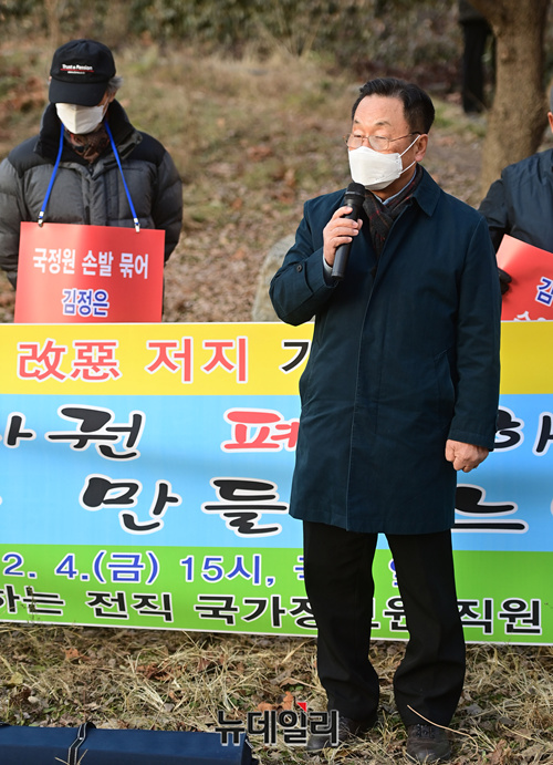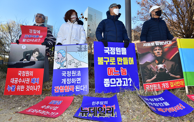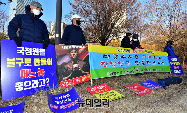 국가정보원 출신 전직 정보요원들이 4일 오후 서울 여의도 생태공원에서 국가정보원법 개정을 반대하는 긴급 기자회견을 갖고 있다. 이날 기자회견은 국회 앞에서 진행될 예정이었지만 민노총의 국회 상경 집회로 장소가 변경됐다.전직 정보요원들은 "대공수사권이 폐지되면 국가안보가 한 순간에 무너져내린다"며 "국민들이 이를 막아달라"고 호소했다.앞서 지난 30일 국회 정보위원회는 국민의힘 소속 위원들이 전원 불참한 가운데 민주당 단독 표결로 국정원의 대공수사 기능을 폐지하는 국정법원 개정안을 통과시켰다. 국정원 개정안은 9일 국회 본회의에서 의결될 예정이다.