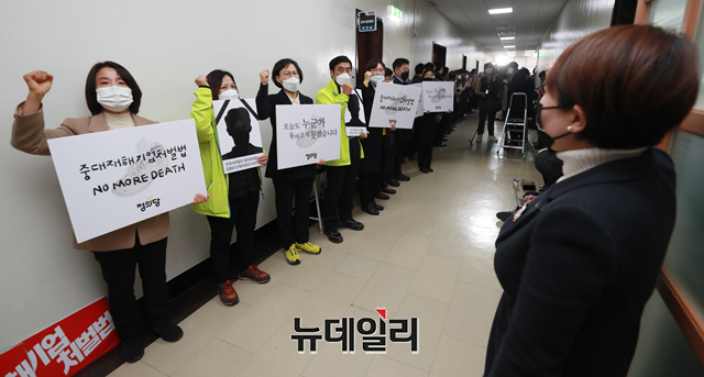 강은미 정의당 원내대표를 비롯한 의원들이 7일 오전 국회 법제사법위원회 법안심사제1소위 회의실 앞에서 중대재해기업처벌법 제정을 촉구하며 구호를 외치고 있다. (사진=공동취재단)