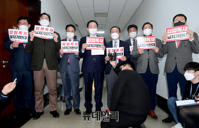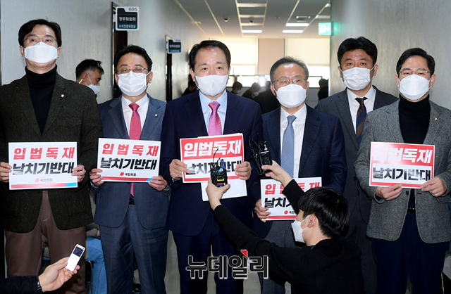 성일종 정무위 국민의힘 간사와 소속 의원들이 7일 오후 국회 정무위원회 회의실 앞에서 기자회견을 갖고 있다. (사진=공동취재단)